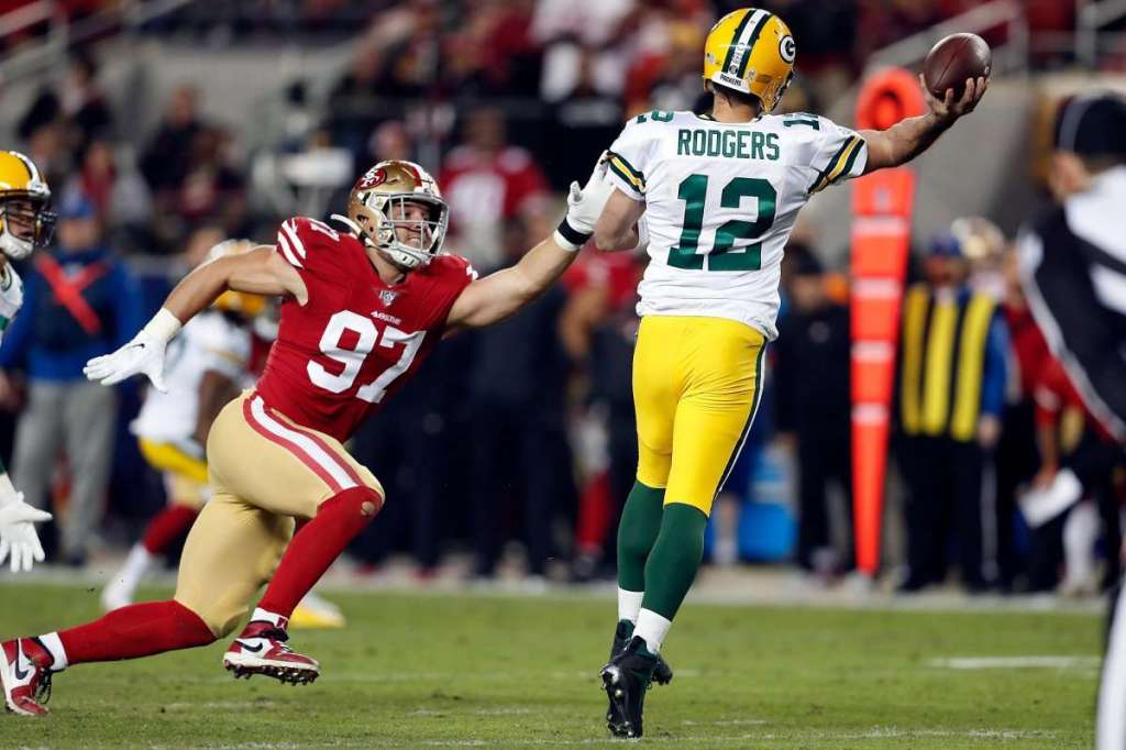 The Dominance Of The 49ers Front Seven: The 49ers defense has now gotten healthy at the right time of the season. Last week they reminded everyone of why they have one of the best front sevens in the NFL. Last week they completely neutralized Dalvin Cook in the running game. Cook was held to only 26 yards of total offense, while the Vikings offense as a whole was held to only 193 total yards. The main reason for this dominance was because of their ferocious pass rush. Kirk Cousins was sacked 6 times in that game and was pressured throughout the game. When the Packers played this team in Week 12 of the NFL season, Aaron Rodgers was sacked 5 times in that game. The Packers run game overall was solid as a unit they ran for 117 yards total in that game. However, Dee Ford and Kwon Alexander didn’t play in that game and now they are back in the 49ers lineup. The Packers offensive line is going to have its hands full this Sunday with guys like Nick Bosa, Dee Ford, and Arik Armstead coming their way. If the 49ers defensive line can terrorize Rodgers all game, then they will win this game. The Packers are going to have to find ways to get the ball out of Rodgers’ hands quick and Rodgers will have to make a lot of throws from outside the pocket this game in order to ward off this pass rush. The Packers running game with Aaron Jones, needs to be able to be effective this game to make Rodgers’ life easier. Considering what the 49ers just did to the Vikings rushing attack, the Packers are going to have their hands full.